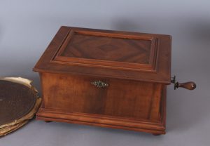 Coffret en bois poli, 44 x 34 x 25 cm. Serrure (sans la clé). Chromolithographie de la marque à l'intérieur du couvercle. Avec 18 disques de la marque Indola (Made in Germany). Mécanisme à revoir. Ensemble en belle condition.
