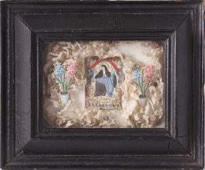 Image pieuse 5,5 x 4, titrée "Gertrudu", avec un décor de paperoles, et deux chromos (fleurs) latérales. Travail naïf, e, bonne condition. Sous verre, cadre noir.