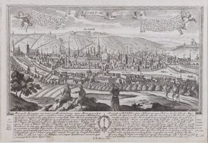 Vue gravée, 20 x 28,5. Titrée en haut. Avec, dans le bas, en allemand, une légende de 55 numéros. Reproduite dans Wahle, Liège dans la gravure ancienne et moderne, p. 31. En très belle condition. Sous passe-partout.