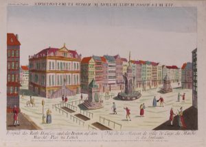 [VUE d'OPTIQUE]. Joseph XHROUET, gravé par NABHOLZ. Vue de la Maison de Ville de Liège,du Marché et des Fontaines. c. 1738.
