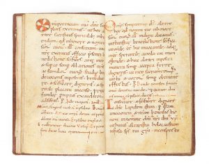 (18+1, II8, III8, iv8, v8, vi8)], écriture romane à l’encre brune (plusieurs mains ; une main majoritaire, avec écriture de deux modules), première ligne de texte copiée au-dessus de la réglure (signe d’archaïsme), texte sur une seule colonne (justification : 113 x 185 mm), piqûres encore visibles, réglure tracée à la pointe sèche, quelques lettres d’attente, rubriques à l’encre rouge pâle le plus souvent en capitales romanes, capitales rehaussées de rouge dans le texte, certaines initiales à l’encre rouge ou brune au décor géométrique sur fonds réservés, initiales simples tracées à l’encre rouge, initiales ornées à l’encre rouge et brune, certaines avec un décor floral ou végétal (par exemple f. 10v ; 11v ; 17 et passim), initiales avec abréviations comprises dans la lettre (par exemple « O/mps » pour « Omnipotens », f. 22 ; « D/s » pour « Deus », f. 24v), musique rajoutée avec notation à points superposés (notation dite « diastématique ») (ff. 1v, 2, 1 1v), des formes plurielles sont parfois indiquées dans les interlignes. Reliure du XVIIIesiècle, veau brun, dos à 5 nerfs, pièce de titre dorée « Vetus Ordo Eccle MSS », tranches mouchetées. Court en marge supérieure et parfois en marge extérieure, avec petite perte de texte par endroits. Intérieur très frais et fort lisible ; encre des rubriques pâle par endroits. Précieux manuscrit liturgique roman non répertorié, ayant servi certainement dans la collégiale de Saint-julien de brioude à partir de la fin du xVe siècle. Les pontificaux ou livres associés des xIe et siècles sont de toute rareté, et toujours précieux pour la connaissance de la liturgie du pontife et des évêques avant sa fixation par la Curie romaine au xIIIe siècle. Ce recueil ne suit pas la séquence traditionnelle du Pontifical romain et semble être plutôt un recueil d’ordines compilés pour un usage local, mais sans indices précis dans les litanies ou dans les prières, à part des références à la règle bénédictine : exécuté en Auvergne ou dans le Sud-Est de la France, son origine exacte reste à déterminer. La rubrique initiale indique : « Incipit ordo ad ecclesiam consecrandam ex Romano editus a beato Gregorio » [Ici commence un ordo pour la consécration de l’Eglise à l’usage de Rome, promulgué par saint Grégoire]. La première de ces ordines figure dans le Liber sacramentorum de circulo anni exposito a sancto Gregorio papa , livre d’oraisons réunies par Saint Grégoire le Grand au IVe s. et remanié sous le pontificat de Grégoire VII (cf. J. Deshusses, Le sacramentaire grégorien , Fribourg, 1992) : cela explique la rubrique en tête qui attribue la paternité du premier ordo à Saint Grégoire. Les ordines suivants contenus dans le présent manuscrit sont repris pour certains dans les Ordines romani (ed. Andrieu, 1961-1974), dans le Pontifical romano-germanique (ed. Vogel et Elze, 1963-1972) et dans le Pontifical romain du XIIe siècle (ed. Andrieu, 1938), sans jamais suivre l’ordre des manuscrits et des éditions connus. Il s’agit peut-être d’une collection intermédiaire destinée à un usage local. Selon une note du XVIIIe siècle en tête, ce manuscrit daterait du Xe siècle, ce qui est une erreur : il a été copié dans la seconde moitié du XIe siècle voire dans les toutes premières années du XIIe. Il est copié d’une large écriture qui alterne avec une écriture de plus petit module. On remarque les lettres « r » descendant sous la ligne, rappelant certains traits des manuscrits bénédictins du Mont-Cassin. Si une origine auvergnate se confirme, on ne peut faire abstraction de la puissante influence de Cluny en Bourgogne, et on compte plusieurs fondations bénédictines anciennes en Auvergne dont Sauxillanges, St-Allyre de Clermont et Aurillac. Il est certain que l’origine bénédictine n’aurait pas dérangé les chanoines de Saint- Julien de Brioude, car il est connu que la collégiale fut fortement influencée par Cluny et la liturgie bénédictine. TExTE : ff. 1-32v, Pontifical (romain) ou Recueil d’ordines pour un évêque, première rubrique, Incipit ordo ad ecclesiam consecrandam ex Romano editus a beato Gregorio ; incipit, "Ponantur reliquie in feretro composite in altera ecclesia pridie quam nova...” [Andrieu, Ordines romani 1, 1931, p. 281] ; relevé des rubriques suivantes : Qui per... [illisible] (f.1) ; Et incipit episcopus (f. 1v) ; Et sequitur oratio (f. 2) ; Exorcismus aque (f. 2v) ; Deinde dicit hanc oracionem oremus (f. 3) ; Benediccio aquae (f. 5) ; Exorcismus salis (f. 5v) ; Benediccio salis (f. 6) ; Benedictio cynerum (encre noire, capitales, feuillet de parchemin inséré entre ff. 6-7) ; Deinde miscetur vinum cum aqua sequitur oracio (f. 7v) ; Iterum dicit oremus et diaconus ut supra et pontifex oremus (f. 8v) ; Ipsi expleti incipit pontifex antiphona (f. 9) ; Et pontifex dicit oremus (f. 9v) ; Iterum dicit oremus. diaconus ut supra sequitur oracio (f. 13) ; Iterum dicat oremus et diaconus ut supra sequitur benediccio (f. 13) ; Ad consecrandam patenam (f. 13v) ; Inde faciens signum crucis de oleo sancto super patenam et dic (f. 14) ; B[enediccio] patene (f. 14) ; Ad calicem benedicendum (f. 14) ; Alia (f. 14v) ; Alia (f. 14v) ; Alia (f. 15) ; B[enediccio] ad lintamina vel ad omnia in usum basilice (f. 15v) ; Alia (f. 16) ; B[enediccio] super munus quodcumque ecclesie offert (f. 16) ; Alia (f. 17) ; Benediccio stolarum (f. 17) ; Oracio (f. 17v) ; Alia (f. 17v) ; Deinde vestitur altare vestibus consecratis... (f. 18v) ; Inde revestatur pontifex cum ordinibus sacris et induantur se vestimentis sollempnibus. Interim ornatur ecclesia et accendantur luminaria.pontifice incipit cantor antiphona as introitum. Terribilis est locus. Et procedit pontifex de sacrario cum ordinibus sacris more sollempni et celebratur ibi missa more solito ordine suo cum gloria in excelsis domino. Tota vero illa ebdomaderia misse pupli