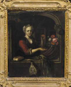 Ecole hollandaise du xviiie siècle, Suiveur de frans Van Mieris La jeune marchande de poissons Panneau de chêne, une planche, non parqueté. H_27 cm L_22,5 cm
