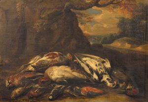 Ecole hollandaise Vers 1700, Suiveur de jan weenix Nature morte au gibier Toile. H_59 cm L_83 cm