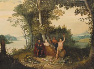 Ecole flamande Vers 1700, Suiveur de jan brueghel Et Hans Van balen Allégorie du Printemps Panneau de chêne, parqueté (restaurations et fentes au panneau). H_53 cm L_70 cm