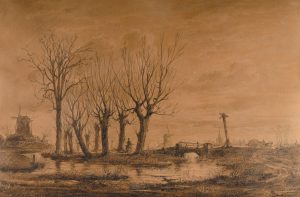 Hendricks frans schaefels 1827-1904) Paysage aux moulins Pierre noire et rehauts de blancs. Signé et daté en bas à gauche Hendricks F. Schaefels 1861 . Dédicacé sur le montage Souvenir affectueux à mon ami Arthur Dubois / Hendricks F. Scharfels...