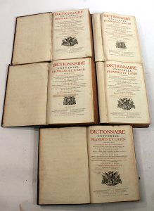 "Dictionnaire Universel François et Latin de TREVOUX", ensemble de (x5) volumes in-folio, reliés d'époque, 1721