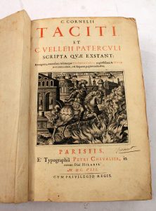 "Taciti et C. Velleii Paterculi", fort volume in-folio, relié d'époque, plats aux armes, 1728 (très usagés)