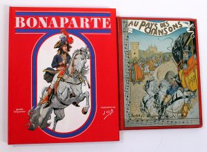 Ensemble de (x2) volumes, grand format, plats illustrés: "Au Pays des Chansons illustré par Job", vers 1900 + "Bonaparte illustré par Job" (réédition de 1975)