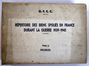 "G.F.C.C - Répertoire des Biens Spoliés en France durant la Guerre 1939-1945 - Tome III - Meubles", texte en français, russe, anglais et allemand, avec photos, relié toile, exemplaire nominatif, 1948