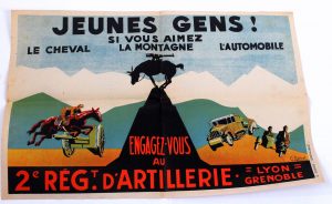 Affiche illustrée couleur, signée C. MOINET, Imprimerie G. GORDE-GRENOBLE, "Jeunes Gens! (...), Engagez-Vous au 2e Regt d'Artillerie - Lyon-Grenoble", vers 1941, 39x59 cm