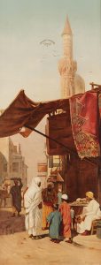 Négociations dans une rue au Caire, chez le marchand d’étoffes. Chromolithographie par Art Frey et Fils. Editée par Munich éditeurs pour la Moutarde Van Rijn’s à Utrecht. Circa 1900. 98x38 cm