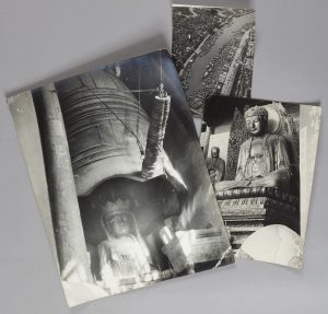 Tirage argentique sur papier. Dim. 29x36cm. Il est joint une seconde photographie de Salze, portant son cachet au dos, montrant une des statues du même temple avec une petite trace de pliure (dim. 19x26), ainsi qu’une vue aérienne du fleuve Huangpu, à Shangai, et sa multitude de bateaux (dim.13x18). Enfin,