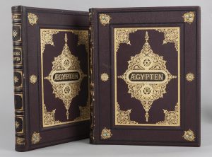 Stuttgart und Leipzig, Hallberger, 1879-1880, 2 volumes in-folio reliés demi-chagrin brun de l’éditeur, dos décoré, plats à décor oriental, d’or et de lapis lazuli, tranches dorées, X+387 et VIII+432 pages illustrées de très nombreuses gravures et de 2 cartes de l’Égypte. Édition originale allemande.