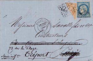 France : Timbre coupé sur lettre non taxée Affranchissement du 29 Sept 1871 : lettre de Maubeuge affranchie avec Yvert n°37 et moitié du 10c bistre (Yvert n°28) en com-plément d’affranchissement. Cette lettre est à destination de Paris,
