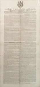 et Uni-verselle Inquisition le 5 avril 1775. Affiche placard in-plano (118,5 x 55 cm.), à Avignon, chez Joseph Blery, impression bilingue en latin et en Français sur papier vergé. Belle vignette gravée aux armes papales. Qqs manques restaurés sans atteinte au texte dans la marge haute à droite, sinon bel état. « Parmi les sollicitudes pastorales qui occupent le Souverain Pontife [Pie Vi] dans le commencement de son règne, celle qui tient la pre-mière place, est celle qui tend à conserver parmi les fidelles, la foi et la religion dans toute sa pureté et réfléchissant en conséquence que pour éloigner les Chrétiens du danger dans lequel une trop grande familiarité avec les juifs pourrait les entrainer, il est nécessaire de faire observer exactement les sages règlements de ses glorieux pré- décesseurs […] » s’ensuivent 44 articles faits d’interdictions sous peine d’amende ou de punitions réglant en détail la vie des juifs du Pape qui ne seront autorisés à quitter leurs quartiers qu’à la révolu- tion : « […] XXXVI Qu’aucun juif ne pusse passer la nuit hors de la juiverie, & que pour cela ils y soient tous retirés environ une heure après la nuit commencée ,sans qu’ils puissent en sortir le matin avant jours, à peine de cinquante écus d’amende & de trois traits de corde en public aux hommes ,et du fouet pour les femmes,& à cet effet ,les portiers prendront bien garde de ne les laisser entrer et sortir qu’aux heures prescrites, & de ne faire entrer aucun Chrétien dans la juiverie lorsque les juifs y sont renfermés […] ».