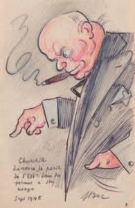 Ferdinand Sigismond Bac (1859-1952) Caricatures, 1945-1952. 18 dessins à l’encre sur papier avec rehauts de crayons de couleurs et aquarelle, signés, légendés et datés. Divers formats : 21 x 13 cm. à 24 x 20 cm. Churchill dénonce le péril de