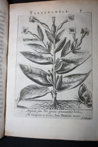 Initialement considéré comme ayant quelques pouvoirs miraculeux sur la santé, le tableau des maladies soignées par le tabac est ici dressé par Neander ; comme stimulant, sa popularité a perduré tout au long du XVIIe siècle ; p. 47, l'auteur raconte néanmoins la mort d'un jeune homme attribuée à son habitude de fumer.