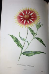 Portefeuille des horticulteurs. Paris, (imprimerie de J.B. Gros), (1847-1848) Tome Ier, seul paru. Grand in-8 ; demi-veau fauve ; 391pp. et 42 planches lithographiées, certaines dépliantes, de fleurs et fruits soigneusement aquarellées et...
