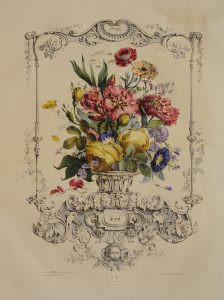 Robin (Armand) : Flore des quatre saisons. Paris, Lithogr. de Derebergue, s.d. (circa mi XIXe) ; in-plano (59x44 cm) , demi-veau ; 12 planches (mois de l'année) lithographiées (coupes de fleurs dans des décors de rocaille), dessinées par Schilt...