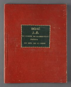 hébreu, reliées en un volume in 4, carton rouge simili maroquin à grain long, grande pièce vert empire portant "Dédié à M. le Comte de Rambuteau Préfet du Dép. de la Seine" en grandes lettres dorées. Rare.