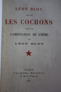 Bloy (Léon) : Devant les cochons suivi de Lamentation de l'épée. Paris, Chamuel, 1894 ; large demi-maroquin bordeaux, chiffre doré en tête du plat, tête dorée, couverture conservée, non rogné. Edition originale rare, bel exemplaire.