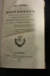 Genlis (comtesse de) : Les dîners du Baron d'Holbach. Paris, Trouvé, 1822 ; in-8 ; demi-basane fauve ; XX, 532 pp. Edition originale, bel exemplaire. On y retrouve les encyclopédistes !