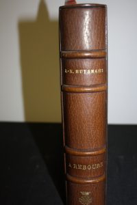 Huysmans (J.-K.) : À Rebours. Pointes sèches coloriées de Coussens. Paris, Kra, 1927 ; petit in 4 ; maroquin marron, contreplat idem autour d'une pièce de soie "art déco", tranches dorées sur témoins, couv. illustrée conservée, gardes de...