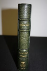 Loti (Pierre) : La Hyène enragée. Paris, Calmann-Lévy, 1916 ; in-16 ; maroquin bleu marine, chiffre doré en queue, tranches dorées sur témoins, quintuple filet doré d'intérieur, non rogné, couverture orange conservée, étui bordé...