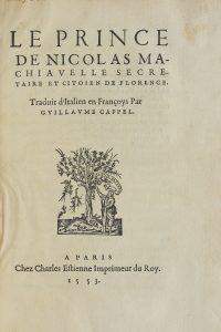 [Machiavel] : Le Prince de Nicolas Machiavelle secrétaire et citoien de Florence. Traduction par Guillaume Cappel. Paris, Charles Estienne, 1553, in-4 veau raciné, dos très décoré (reliure fin XVIIIe). Edition originale de la première...