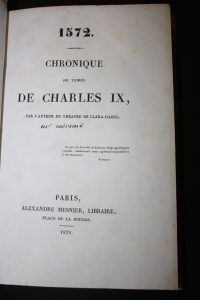 [Mérimée] : 1572. Chronique du temps de Charles IX par l'auteur du Théatre de Clara Gazul. Paris, Mesnier, 1829, in-8 dos basane marbrée, [4], XV, [1] bl., 383 pp. Edition originale assez rare et recherchée dit Clouzot. Quelques petites...