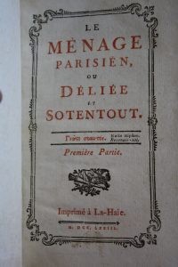 [Rétif de La Bretonne (Nicolas-Edme)] : Le Ménage parisien ou Deliée et Sotentout. La Haye, s.n. (Rouen, Leboucher), 1773 ; 2 parties en un tome in-12 ; veau glacé ; début imprimé en rouge et noir ; [10], 186, XXXII ; [2], 186, pp. XXXII-XCII,...