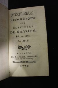 [Bordier] : Voyage Pittoresque aux glacières de Savoye fait en 1772 par M.B. Genève, La Caille, 1773, in-12 basane marbrée. Edition originale rare. Trou de vers en bas du dos sinon bon état. (Jacques Perret Regards sur les Alpes 100 livres...