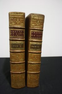 Aelianus : Gesneri De Natura Animalium. Libri XVII. Cum animadversionibus Conradi Gesneri... Londini (Londres), Bowyer, 1744, 2 vol. in-4 veau fauve, tranches rouges. Edition gréco-latine. Petits frottements, très bel exemplaire. "Edition savante"...