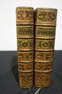 Callimachus : Hymni Epigrammata & Fragmenta. Leyde, 1761, 2 vol. in-8 veau marbré, tranches dorées. Frontispice gravé, 6 figures, vignettes in texte. Edition gréco-latine. Magnifique exemplaire. "Edition la meilleure que nous ayons de ce poète"...