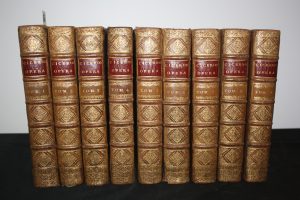 atteinte au texte ; 1 tome avec les 2 coiffes abimées et un coin usé, tout le reste en très bel état. Très bonne édition donnée par l'abbé d'Olivet, ami de Boileau et professeur de Voltaire, membre de l'Académie Française.