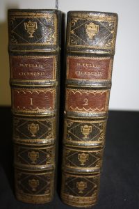 [Cicéron] Tulii Ciceronis : Epistolarum libri XVI ad familiares. Amsterdam, Daniel Elzevier et Leyde Hackius, 1676-1677, 2 vol. in-8 maroquin vert, dos à décor de roses, pièces grenat, roulette géométrique sur les plats, et d'intérieur,...