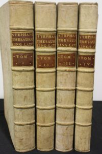 Estienne (Robert) : Thesaurus Linguae Latinae, in-4 tomus divisus. Basilae, Thurnisiorum Frat., 1740, 4 vol. in-folio vélin. Bel exemplaire de cette édition, très estimée.