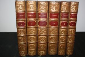 Lucien : Oeuvres. Traduit du Grec. Paris, Bastien, 1789, 6 vol. in-8 peau de porc fauve, dos très décoré et doré, pièces rouges, triple filet doré et fleurons d'angles, roulette intérieure, tranches dorées. Portrait en frontispice. Très bon...
