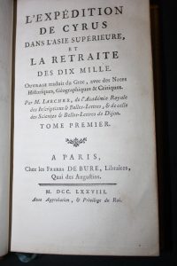 [Xenophon] : Expédition de Cyrus dans l'Asie supérieure et la Retraite des Dix Mille. Traduit par Larcher. Paris, De Bure, 1778, 2 tomes en 1 volume petit in-8 veau blond, tranches dorées, dos décoré de fers symboliques militaires (P. Bozerian),...