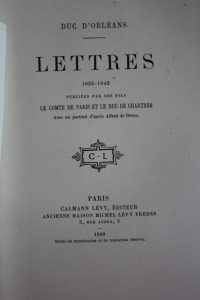 Orléans (Ferdinand-Philippe-Louis, d'abord duc de Chartres, puis duc d' ; 1810-1842) : Lettres 1825-1842. Publiées par ses fils le comte de Paris et le duc de Chartres, avec un portrait d'après Alfred de Dreux. Paris, Calmann-Lévy, 1889 ; in-8 ;...