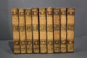 Paris, Buisson, 1793 (2e édition) ; 9 tomes in-8 ; veau brun tacheté de rose, dos lisse très décoré et doré, pièce fauve ; Portrait par Vanloo en frontispice, 2 portraits, 1 plan et 1 planche dépliante, 2 tableaux dépliants.