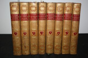 Sismonde de Sismondi (J.C.L.) : Histoire des Républiques italiennes du Moyen-Age. Paris, Nicolle, 1809 ; 8 tomes in-8 ; veau raciné glacé, dos très décoré et doré, roulette d'encadrement. Quelques minuscules manques de cuir sur les plats,...