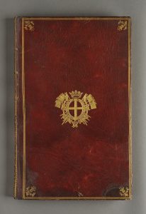 grenat, grandes armes de Castries sur les plats, fleurons dorés en écoinçons dans un cadre de triple filet doré, dos décoré et doré, tranches dorées, roulette intérieure; [64] ff., les 3 premiers et les 2 derniers blancs ; texte entièrement aquarellé : gris vert, rose, doré, rouge, bleu gouaché ; nombreux blasons en couleurs (une centaine), très soignés. Chiffre "E.C." ; le texte est dans un encadrement aquarellé.