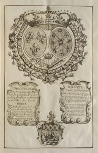 Chronologie des Prévosts des Marchands, Échevins, Procureurs du Roi, Greffiers et Receveurs... de la ville de Paris par Chevillard (Jacques), 1729. In-folio manuscrit et imprimé découpé et collé: [14]pp. manuscrites de Titre et Tables, 93 ff....