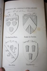 La Tour-Varan : Armorial et généalogie des familles qui se rattachent à l'Histoire de Saint-Etienne ou aux Chroniques des chateaux et abbayes. Saint-Etienne, Montagny, 1854 ; in-8 ; demi-chagrin vert ; VIII, 470 pp., [1] f., 11 planches de blasons...