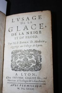 Barra (P.) : L'Usage de la Glace, de la Neige et du Froid. Lyon, Cellier, 1675, in-12 basane brune. Reliure usagée, coiffes absentes. Rare. (Vicaire.66, qui donne par erreur 1676).