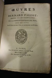 Palissy (Bernard) : Oeuvres, revues sur les exemplaires de la bibliothèque du Roi, avec des notes de M. Faujas de St-Fond et des additions par M. Gobet. Paris, Ruault, 1777, in-4 demi-vélin à coins, 1ère édition collective, rare. Non rogné....