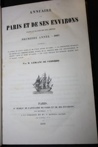 Annuaire de Paris et ses environs par Leblanc de Ferrierre. Première année.1837. Paris, Aux bureaux, Librairie Vve Dondez-Dupré, 1837 ; in-8 ; demi-reliure, dos décoré à froid. Carte dépliante, annuaire des métiers. Description de toutes les...