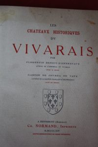 Benoit d'Entrevaux (pour le texte) et Gaston de Jourda de Vaux (pour les dessins) : Les châteaux historiques du Vivarais. Hennebont, Normand, 1914 ; in-4 ; demi-maroquin marron, chiffre couronné en queue, tête dorée, couverture conservée. 377...