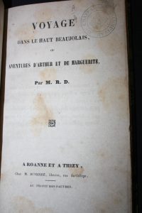 [La Rochette (Maxime Rimoz de)] : Voyage dans le Haut Beaujolais ou aventures d'Arthur et de Marguerit. Par M.R.D. Roanne et Thizy, Duvierre (Imp. de Ferlay), [1847] ; in-8 ; demi-chagrin vert foncé (Pierre Robert, rel.) 67, [1] pp. Dos passé ;...